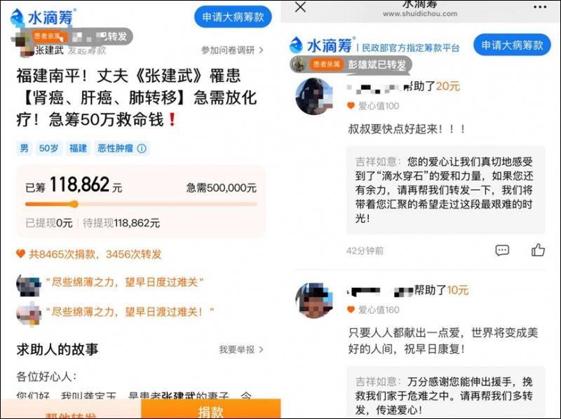 张建武今年50岁,来自于福建南平市浦城县古楼乡洋溪村的一个普通的农村家庭,家里有两个孩子以及年迈的双亲。这些年,张建武在福州靠摆摊卖煎饼维持生计,今年10月,在福建省肿瘤医院诊断为肾癌,癌细胞已经广泛转移到肝脏和肺部,后续只能依靠放化疗等综合治疗来控制病情。在家庭积蓄都花完之后,妻子通过水滴筹发起筹款。据水滴筹筹款链接显示,目前得到了8465名爱心网友捐款以及3456名爱心网友帮助转发,共计筹款118862元,其中陌生人捐款比例高达90%。